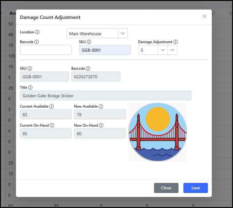 | Introduction | Adjust Damaged is a way to reduce the current On Hand and Available inventory counts for a SKU due to damaged product. Note that this process does not use the Shopify Unavailable/Damaged counts, rather it behaves like the Adjust On Hand process when a decrease in inventory is processed. |