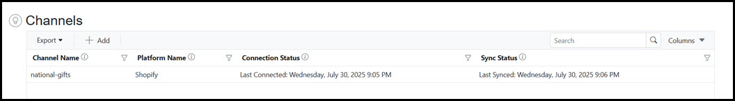 The Channels grid displays all Shopify Storefronts currently added within Skuttlefish. Select a Channel to view the Channel details or click the + Add button to add a new Channel.