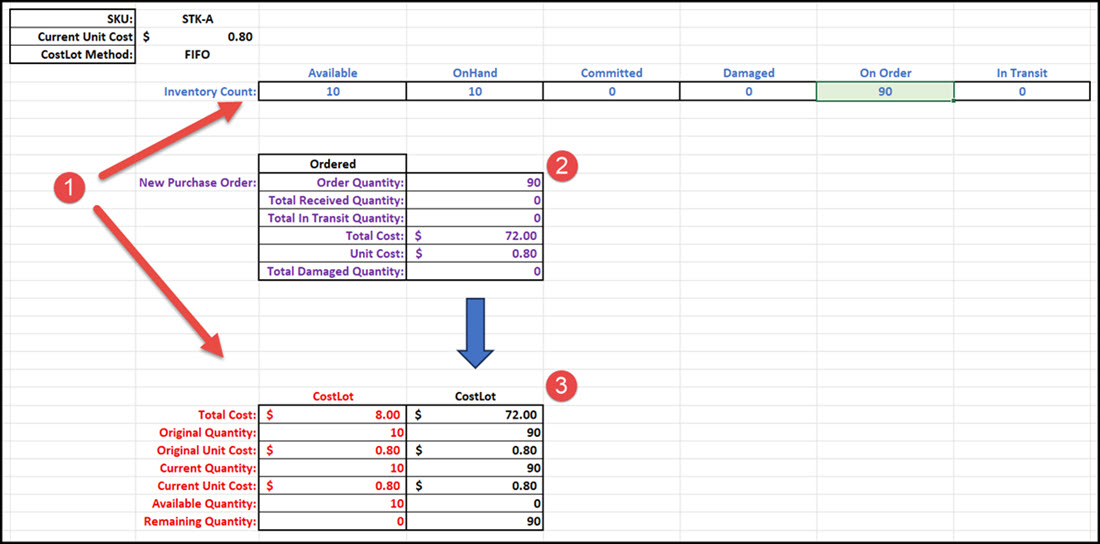 The example below demonstrates how the system creates and depletes Cost Lots to manage inventory movements.