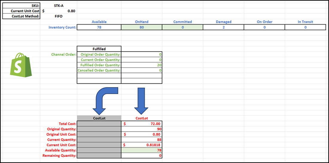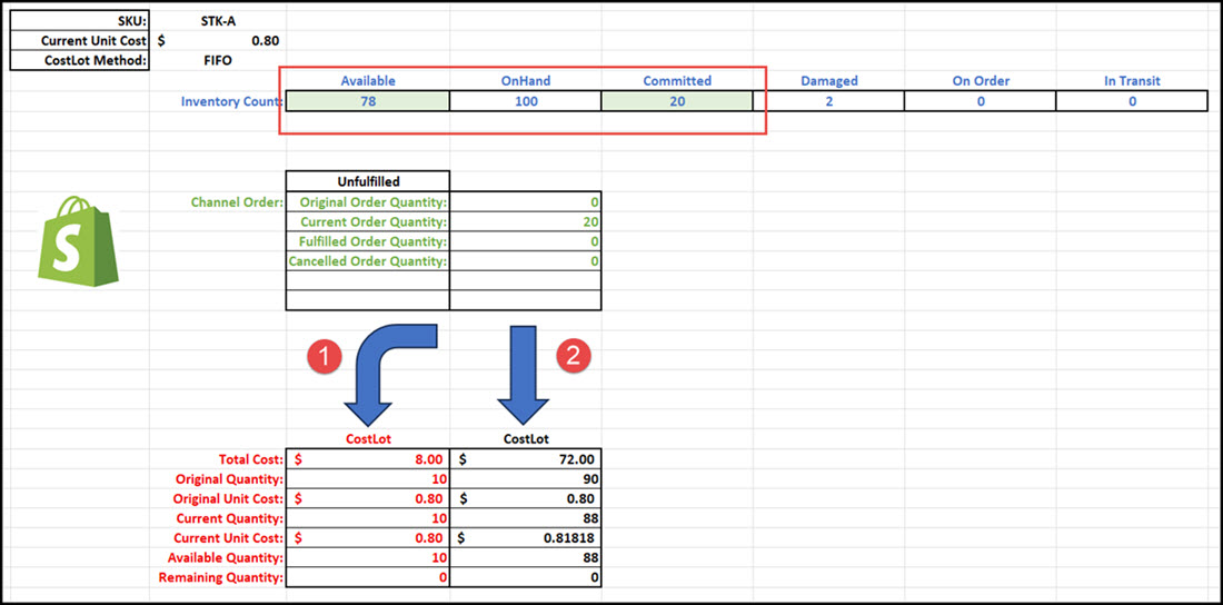In the example below, an order for 20 items is shown impacting the associated Cost Lots. When created, the order will adjust the Available and Committed inventory counts in Skuttlefish. Once fulfilled, Skuttlefish will: