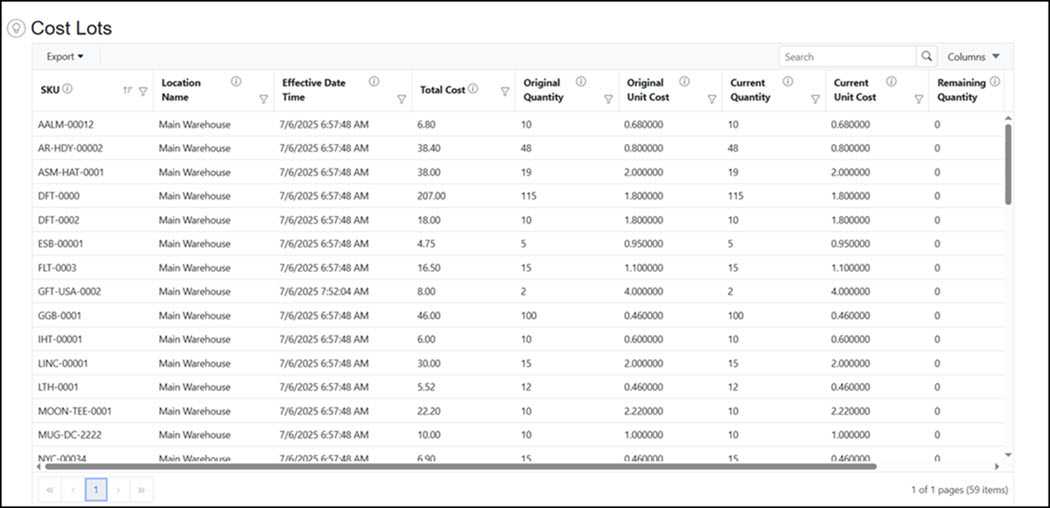 The Cost Lots grid provides a quick view of all active Cost Lots in the system. It supports searching, filtering, and sorting, along with options to export the data to Excel or PDF formats. For more detailed insights, additional Cost Lot information is available through the Reporting module.