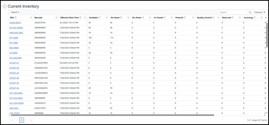 The Current Inventory Grid displays the real-time breakdown of available product by location as well various other inventory status of product within each location. The Current Inventory Grid allows for searching, filtering, and sorting of contents as well as the ability export to Excel or PDF file formats.