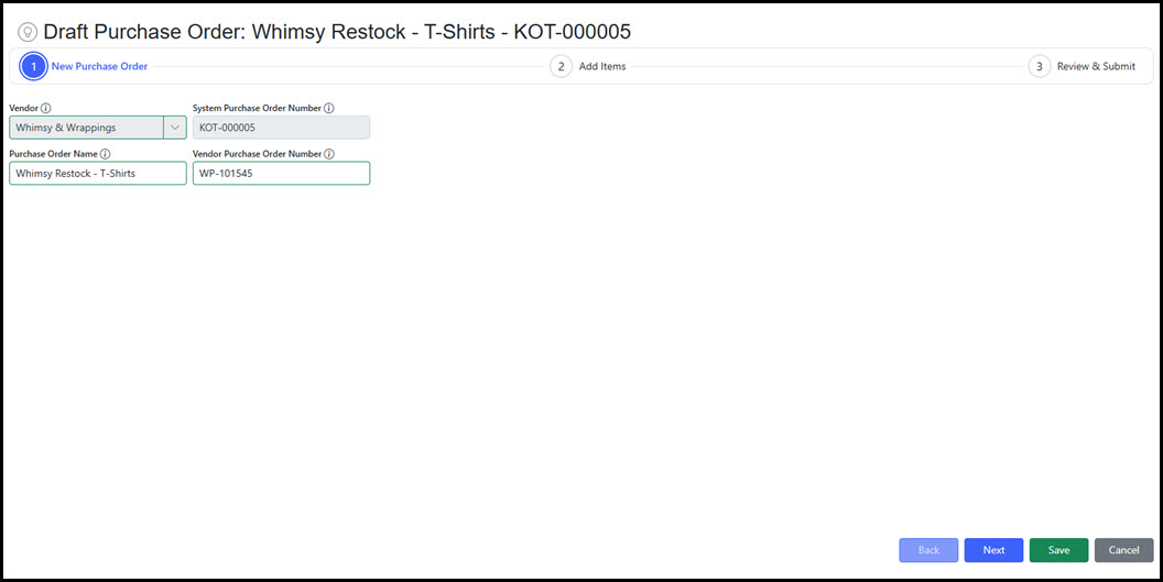 The Draft Purchase Orders view allows the initiation of purchase orders for the replenishment of items from vendors set up within Skuttlefish. The wizard walks through the creation of a new purchase order until it is marked for submission to the vendor.