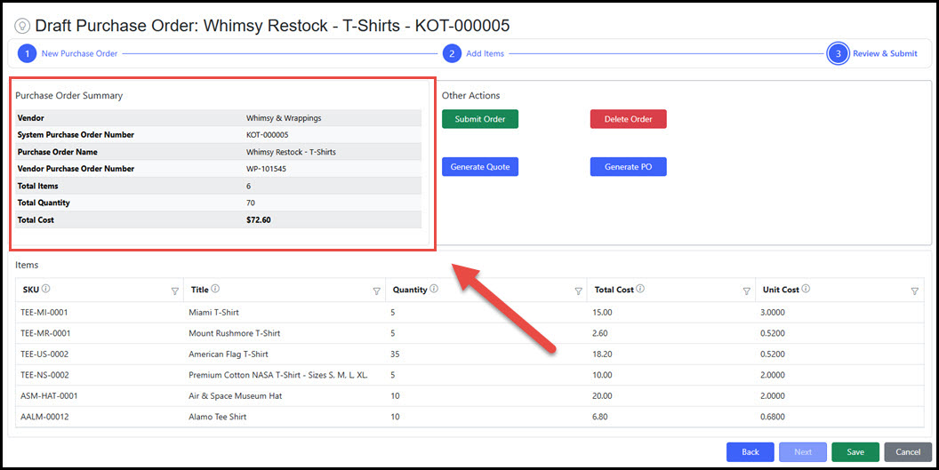 The Purchase Order Summary area displays purchase order information including the total items, quantities, and cost.