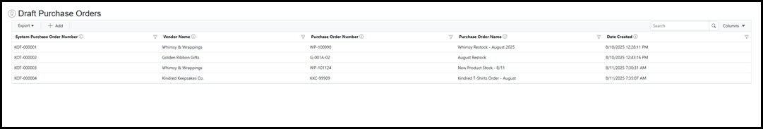 The Draft Purchase Orders grid displays all current Purchase Orders that have been created but have not yet been submitted for order. This grid allows for searching, filtering, and sorting of contents as well as the ability to export to Excel or PDF file formats.