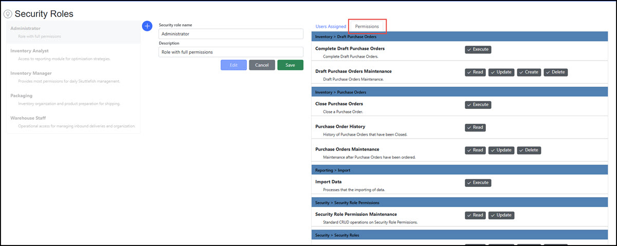 The Permissions tab displays the privilege setting for each permission. Privileges can be toggled on/off directly within the screen to configure the selected Security Role.