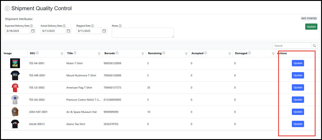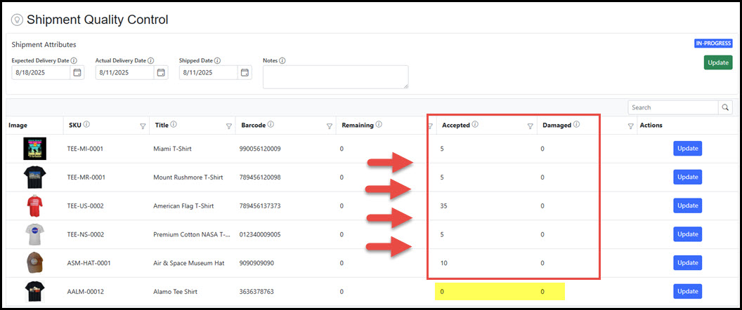 To log the items as quality control reviewed in a received shipment, click the Update button for the item to access the Quality Control Entry screen.