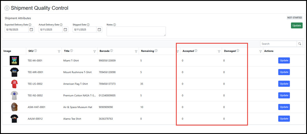 The Shipment Quality Control Manager view consists only of items that have been entered as "Received" in the Shipment Receiving process. Here, the quality control process can move items to an "Accepted" or "Damaged" status based upon physical review or other quality assurance processes.